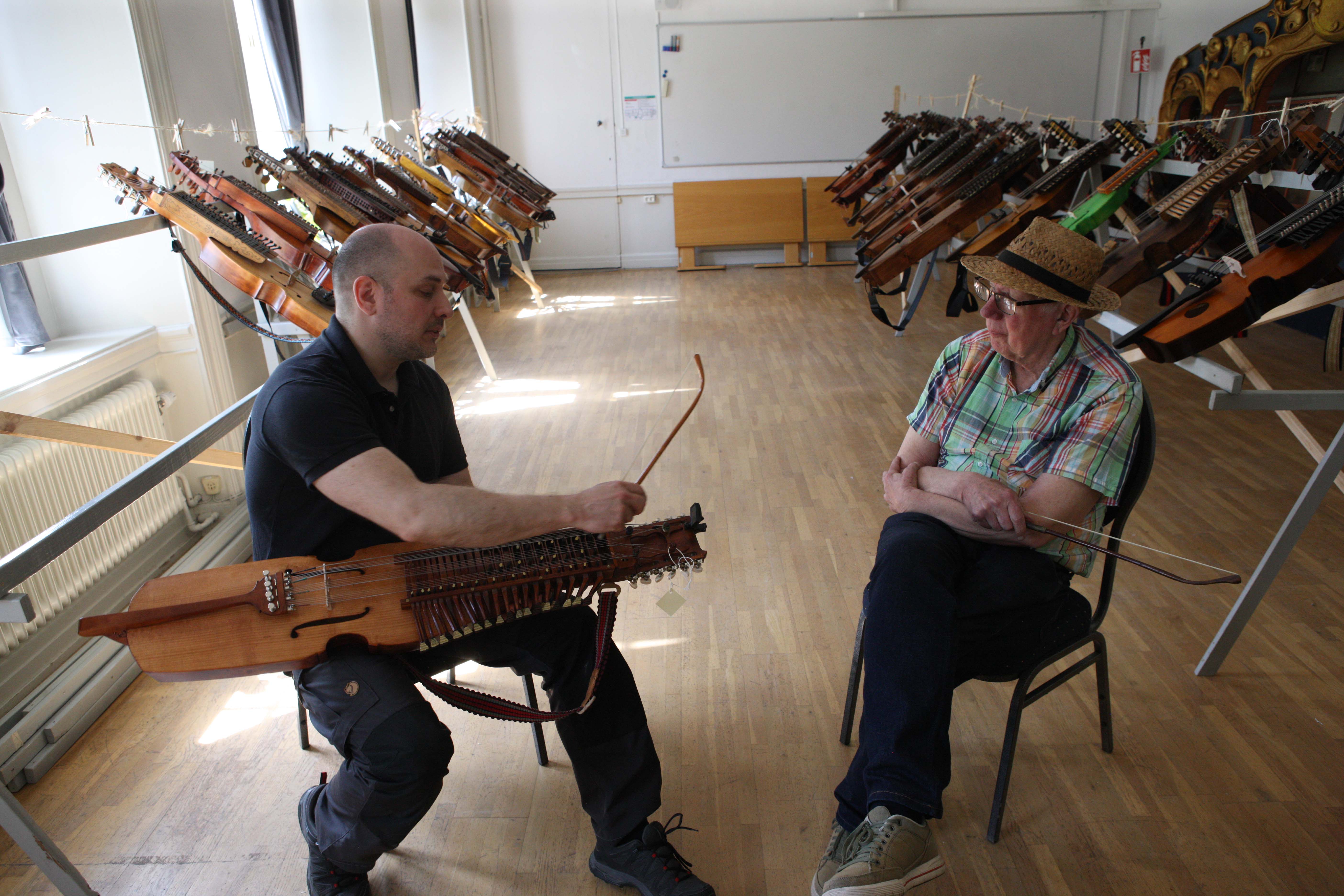 Björn och Sigurd Sahlström diskuterar under harpbedömningen |