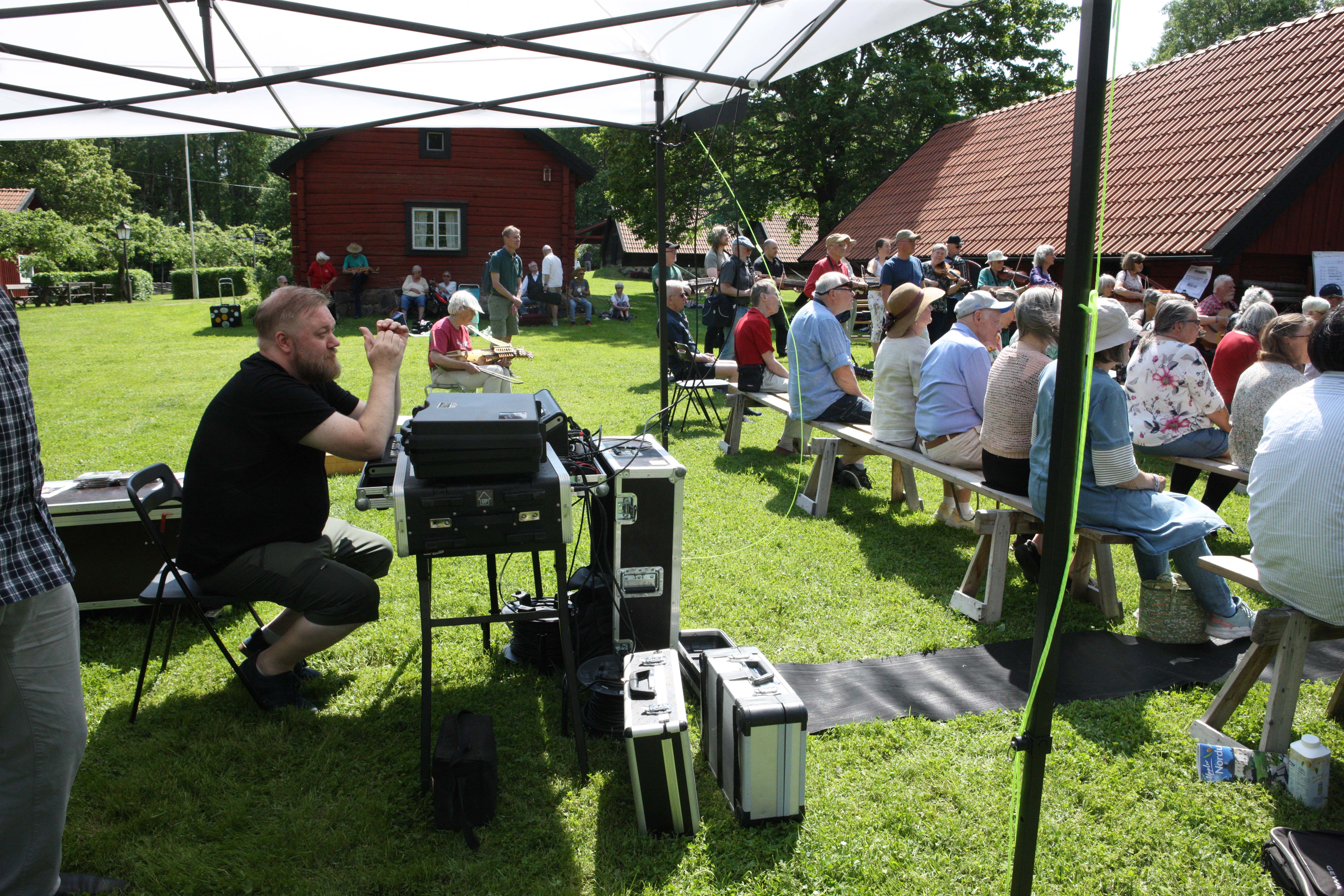 Henning Andersson har full koll på ljudet i sin anläggning. Här på Gilledelen av stämman. Dvs på lördagen på hembygdsgården |