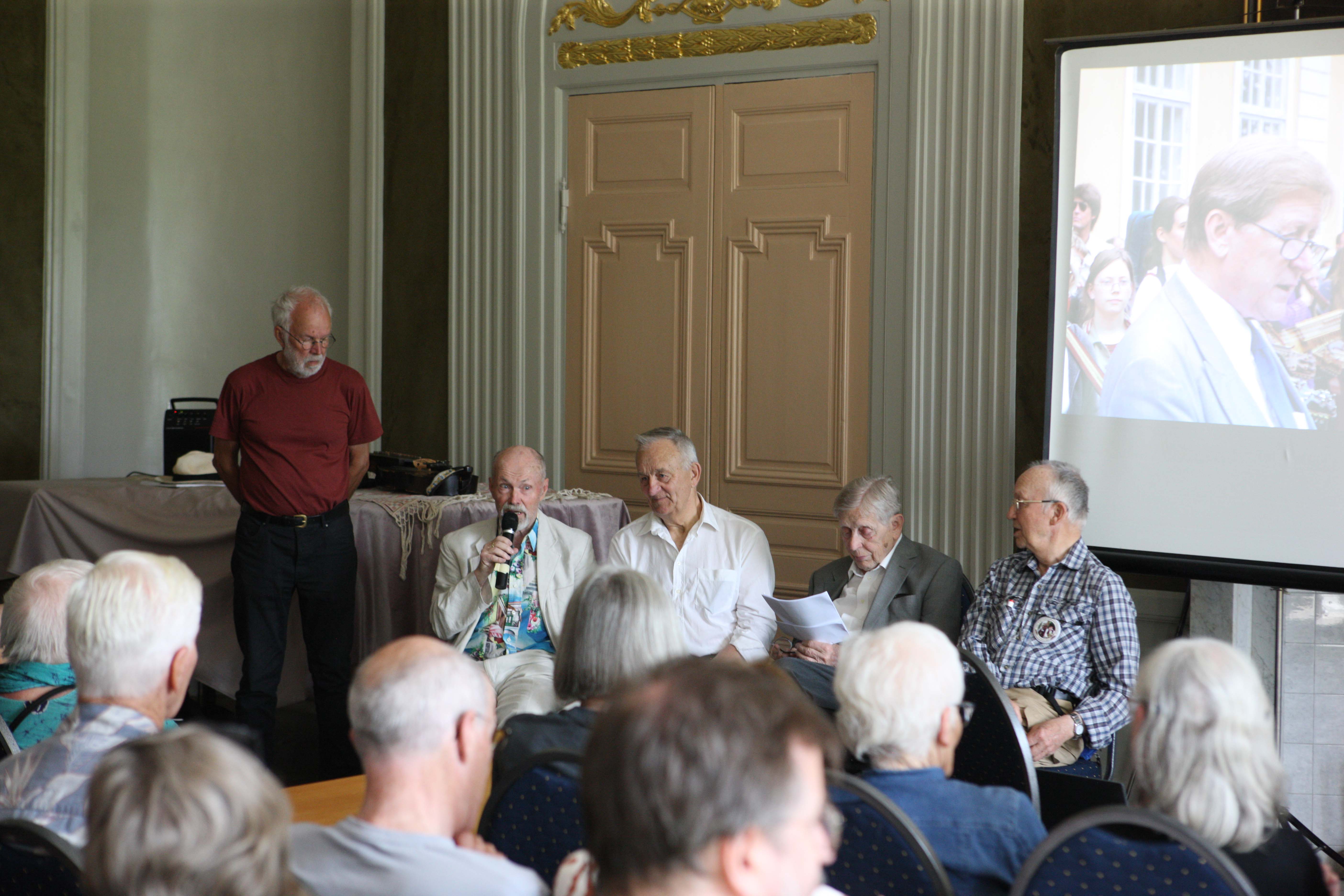 Paneldiskussion i stora salen på herrgården, med anledning av stämmans 50-årsfirande. Med mikrofonen Leif Alpsjö. Sedan Sven-Olof Sundell, Gunnar Ahlbäck samt Gunnar A ser vi även på over headbilden |