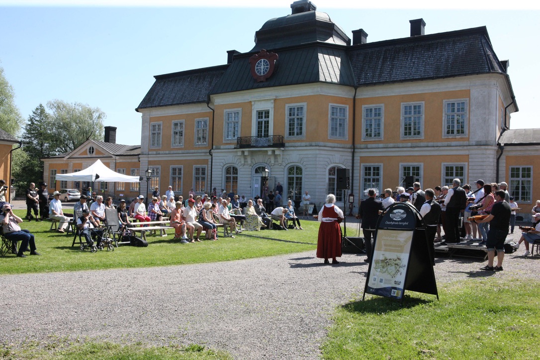 Publik och spelmän på borggården framför herrgården |